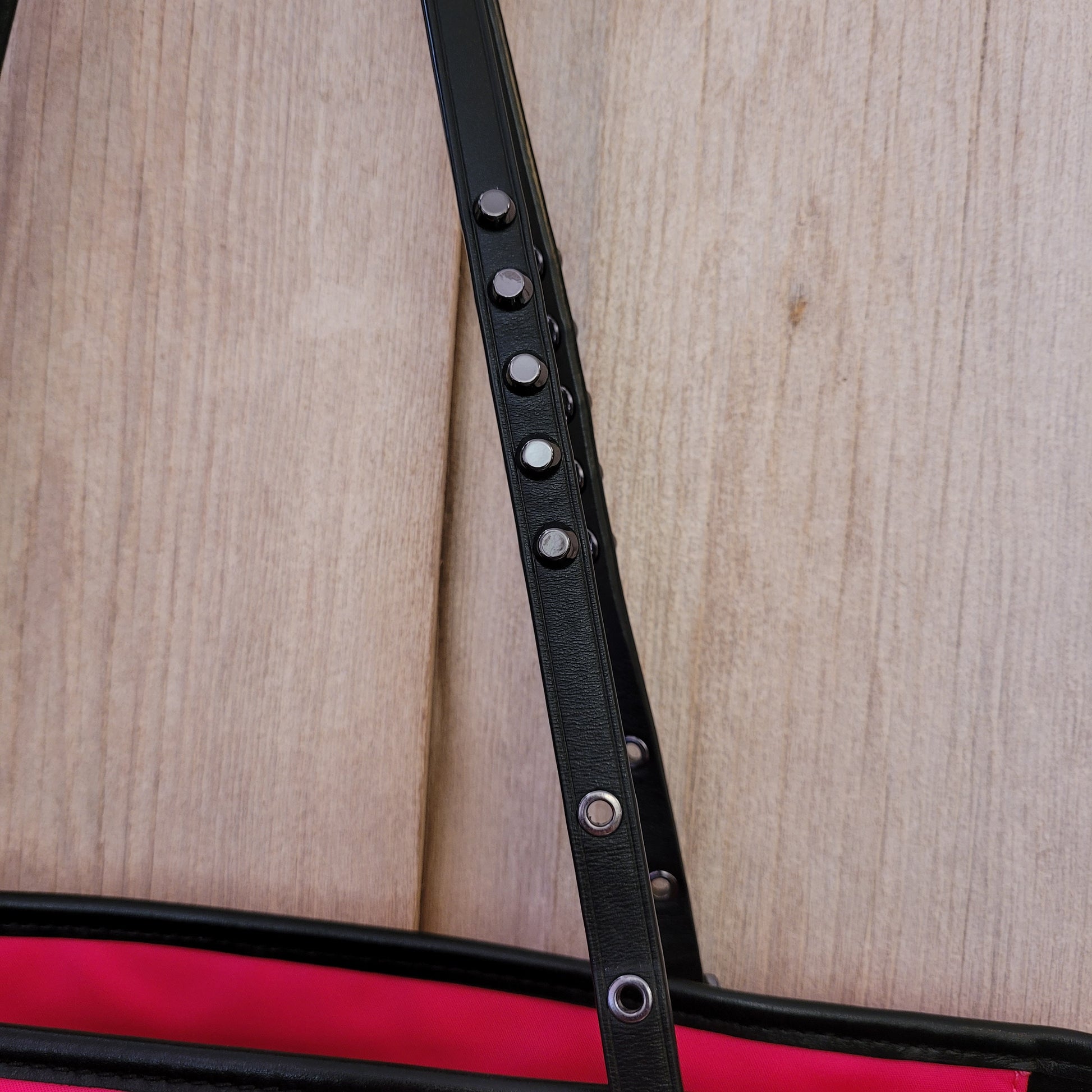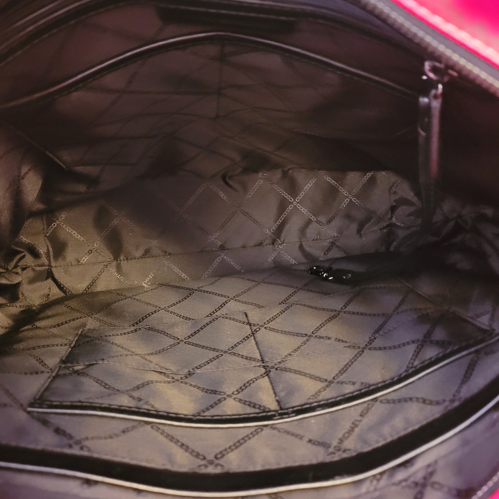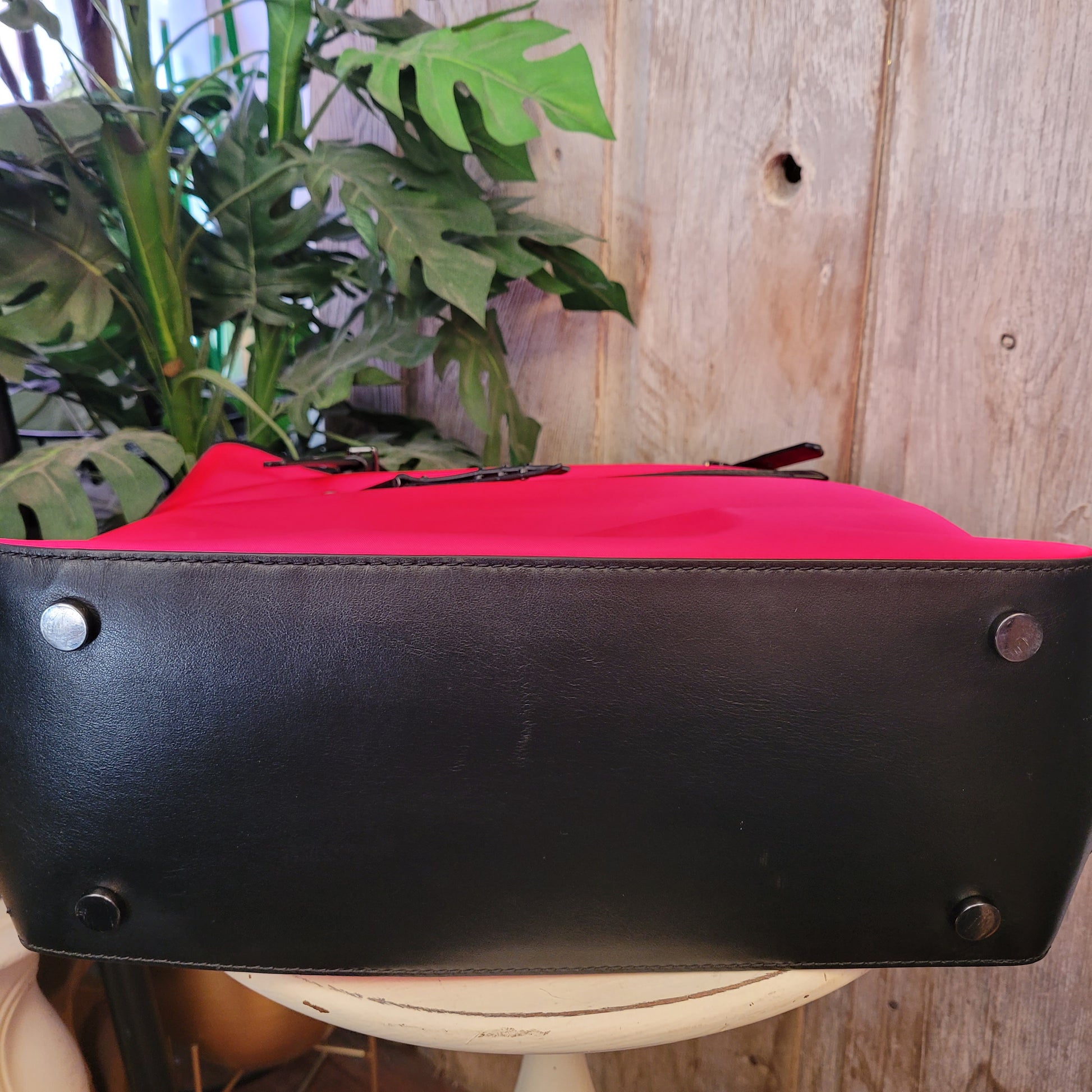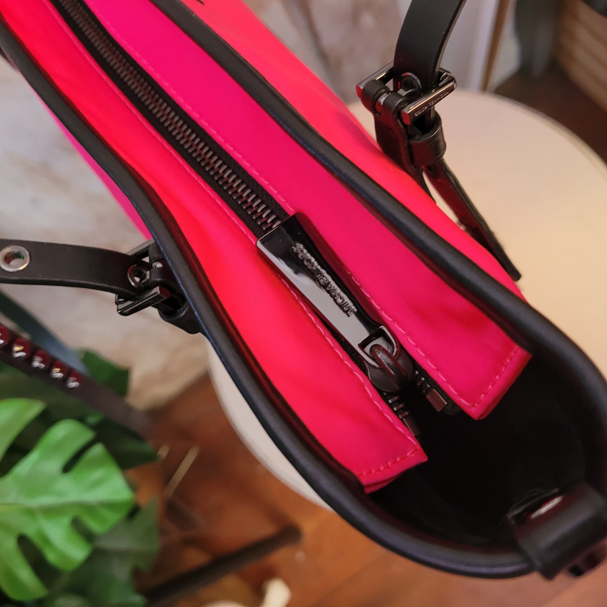 Michael Kors pink tote nylon tote with black leather trim and gunmetal studded detail. Features a front zip pocket and several interior pockets and key fob strap.